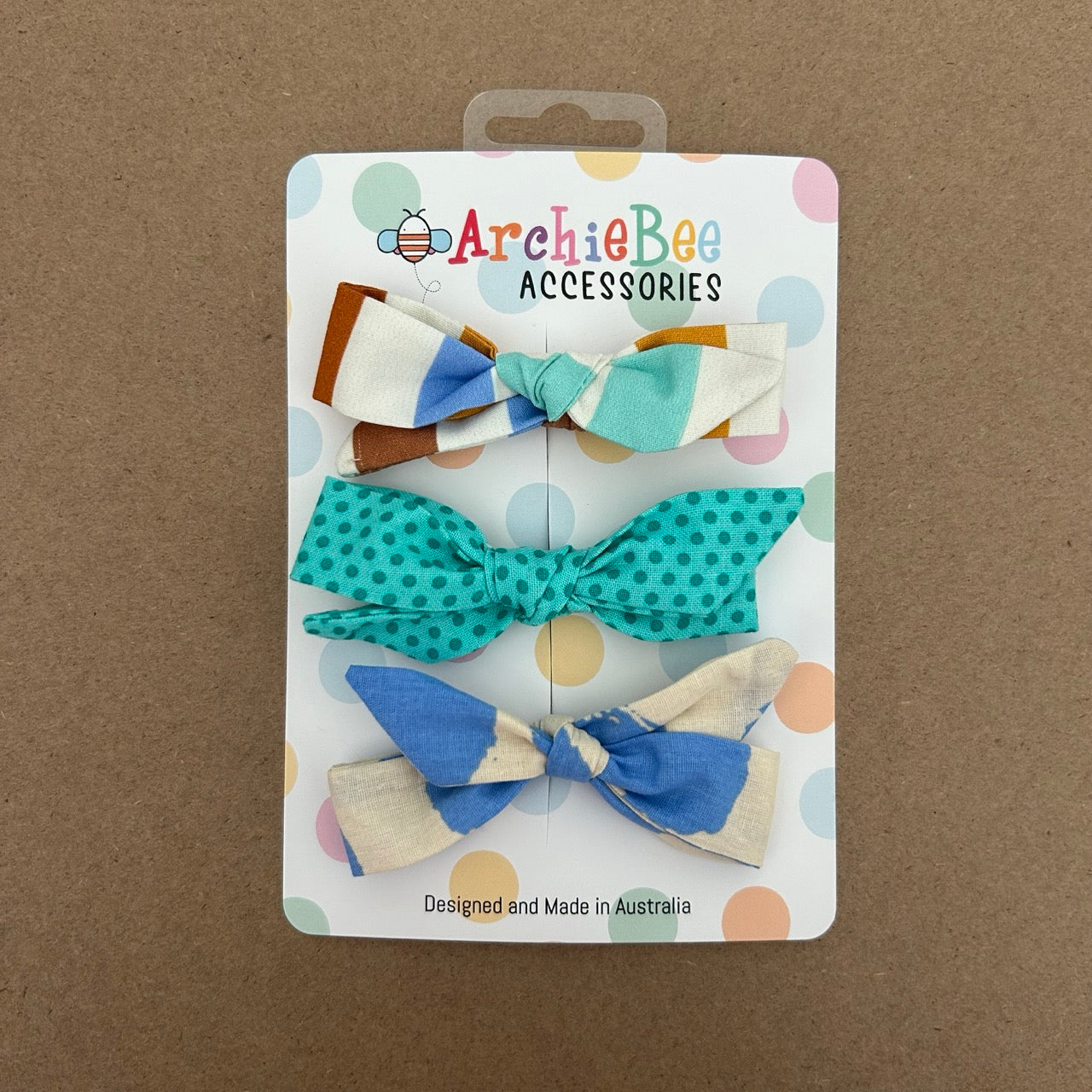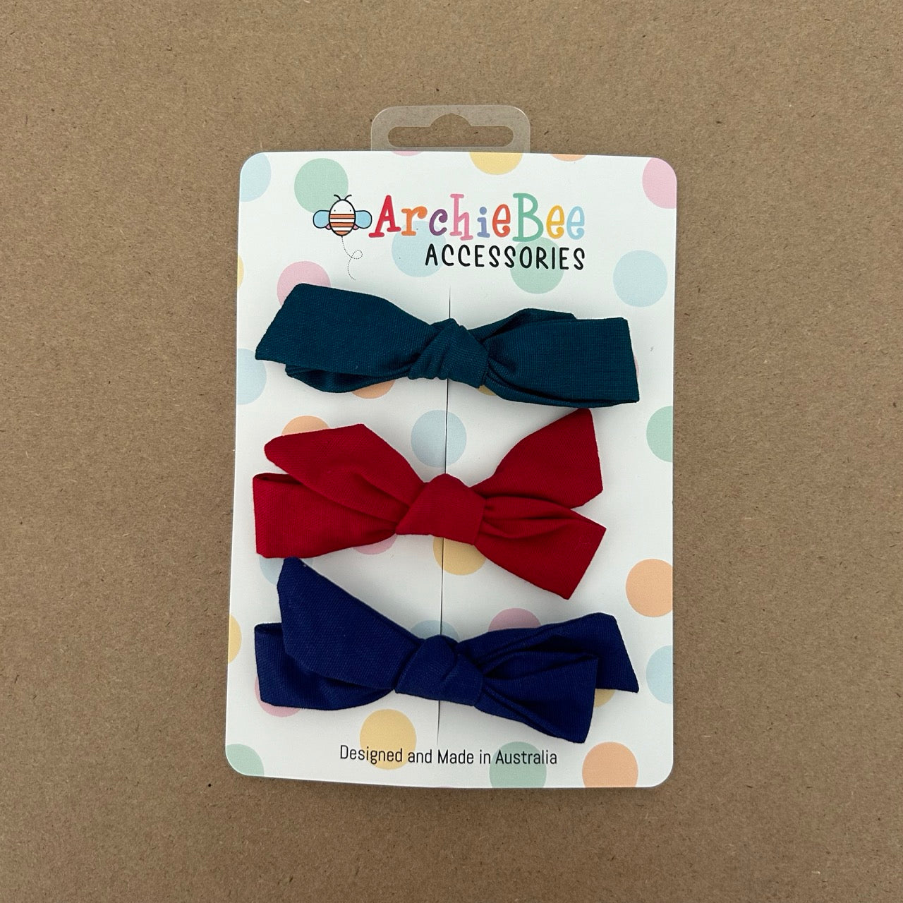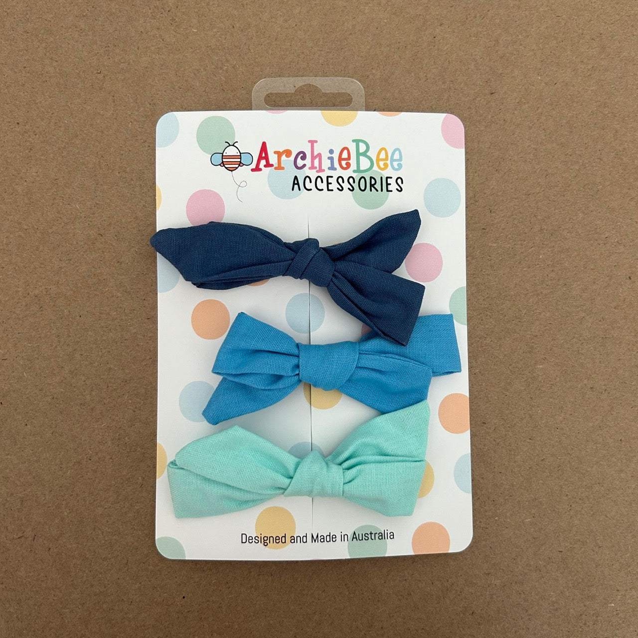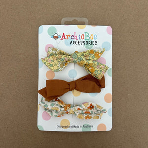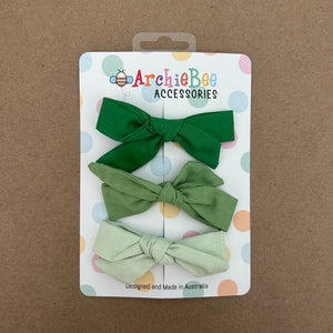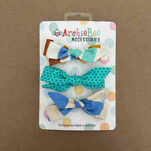 Designed to add that finishing touch to your ArchieBee outfits, our hand stitched trio of bows have a sturdy clip to wear either in hair or as a buttonhole bowtie.