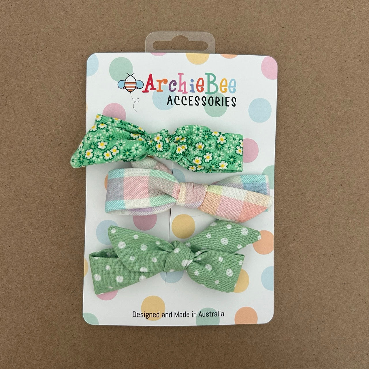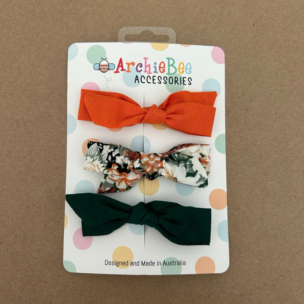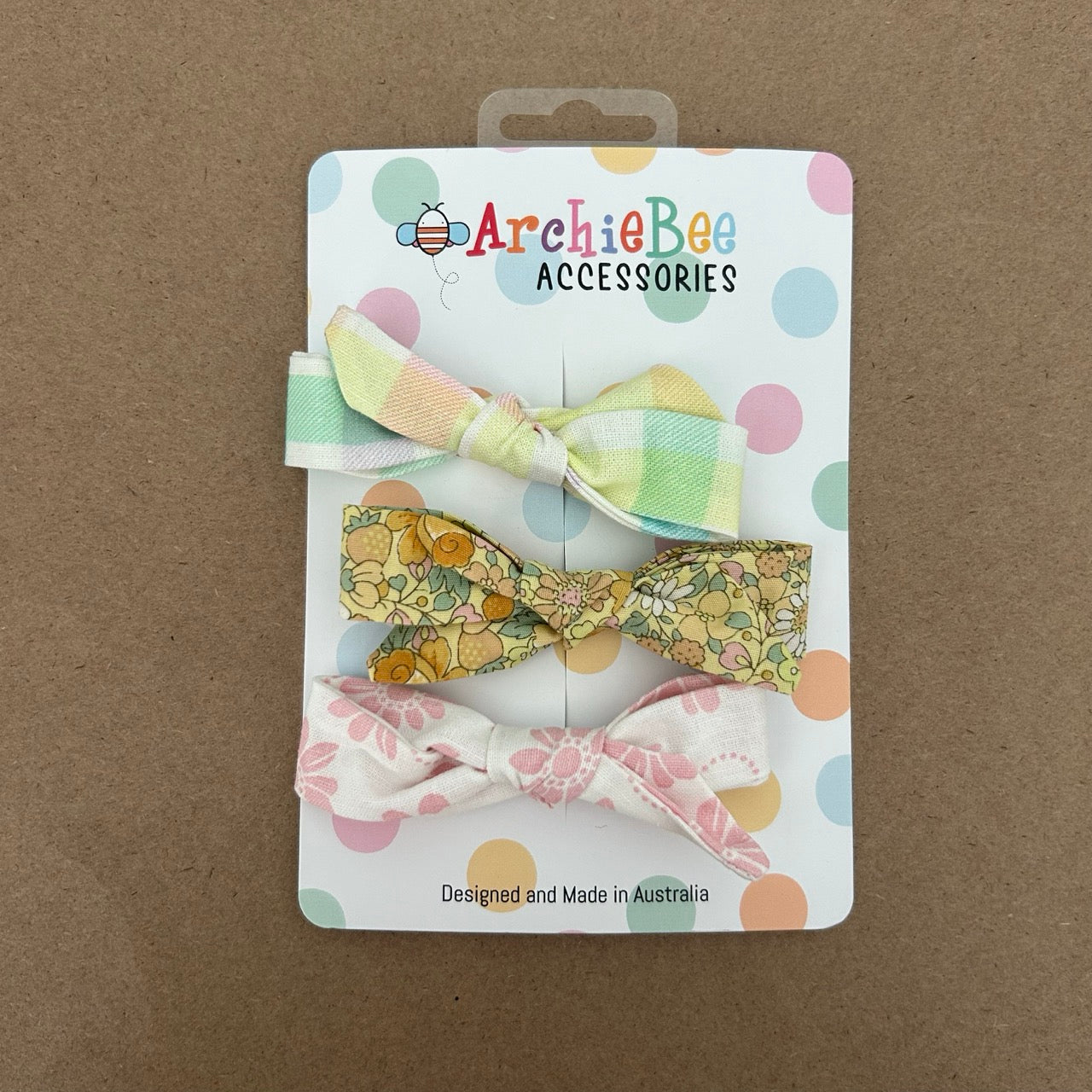 Designed to add that finishing touch to your ArchieBee outfits, our hand stitched trio of bows have a sturdy clip to wear either in hair or as a buttonhole bowtie.