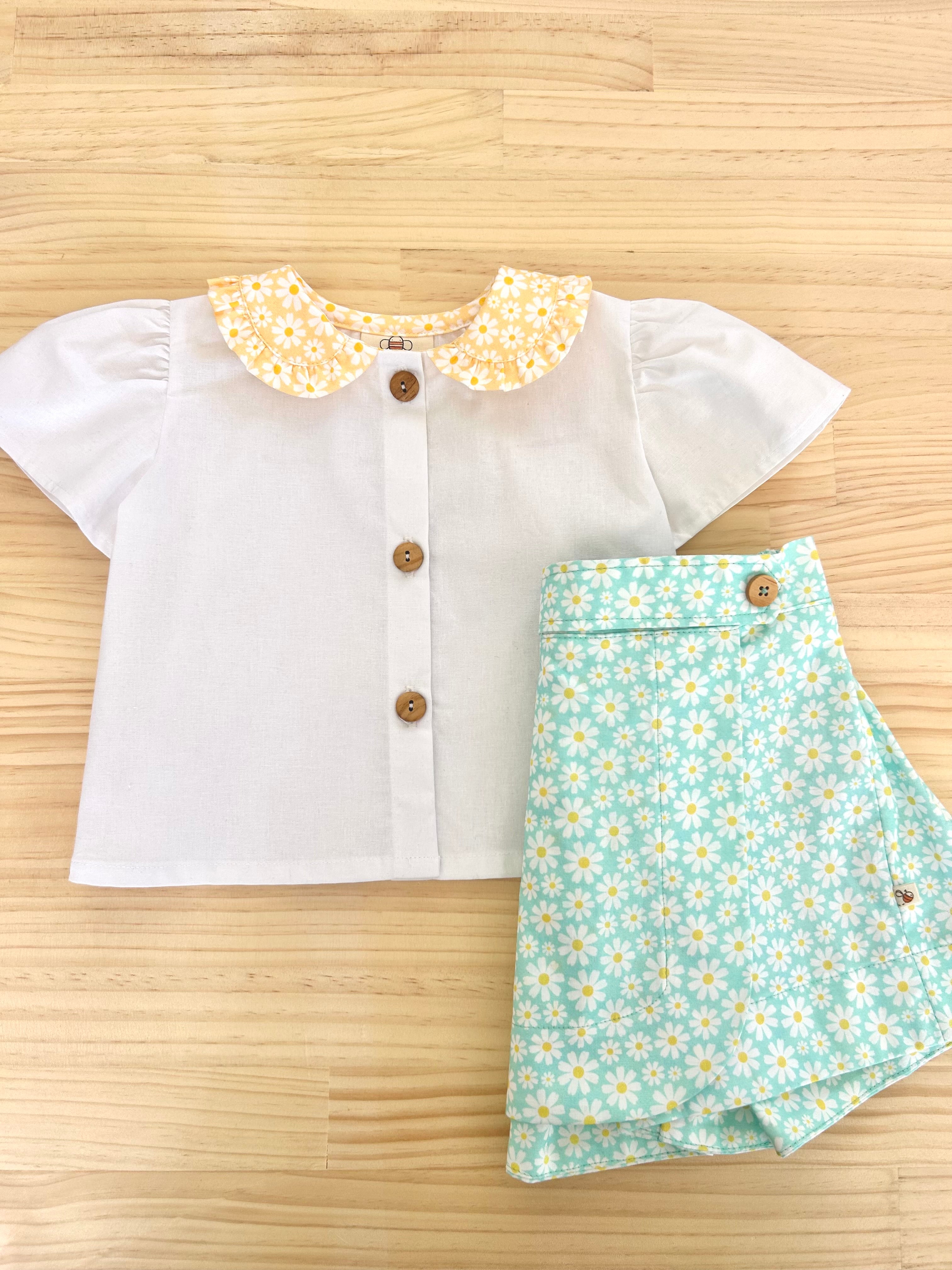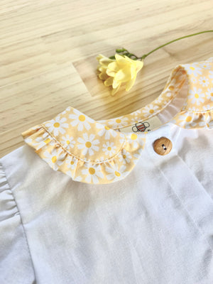 Professionally sewn from white 100% cotton, she has sweet puff sleeves, buttons down the front and the most glorious feature collar in the sunshine floral fabric.